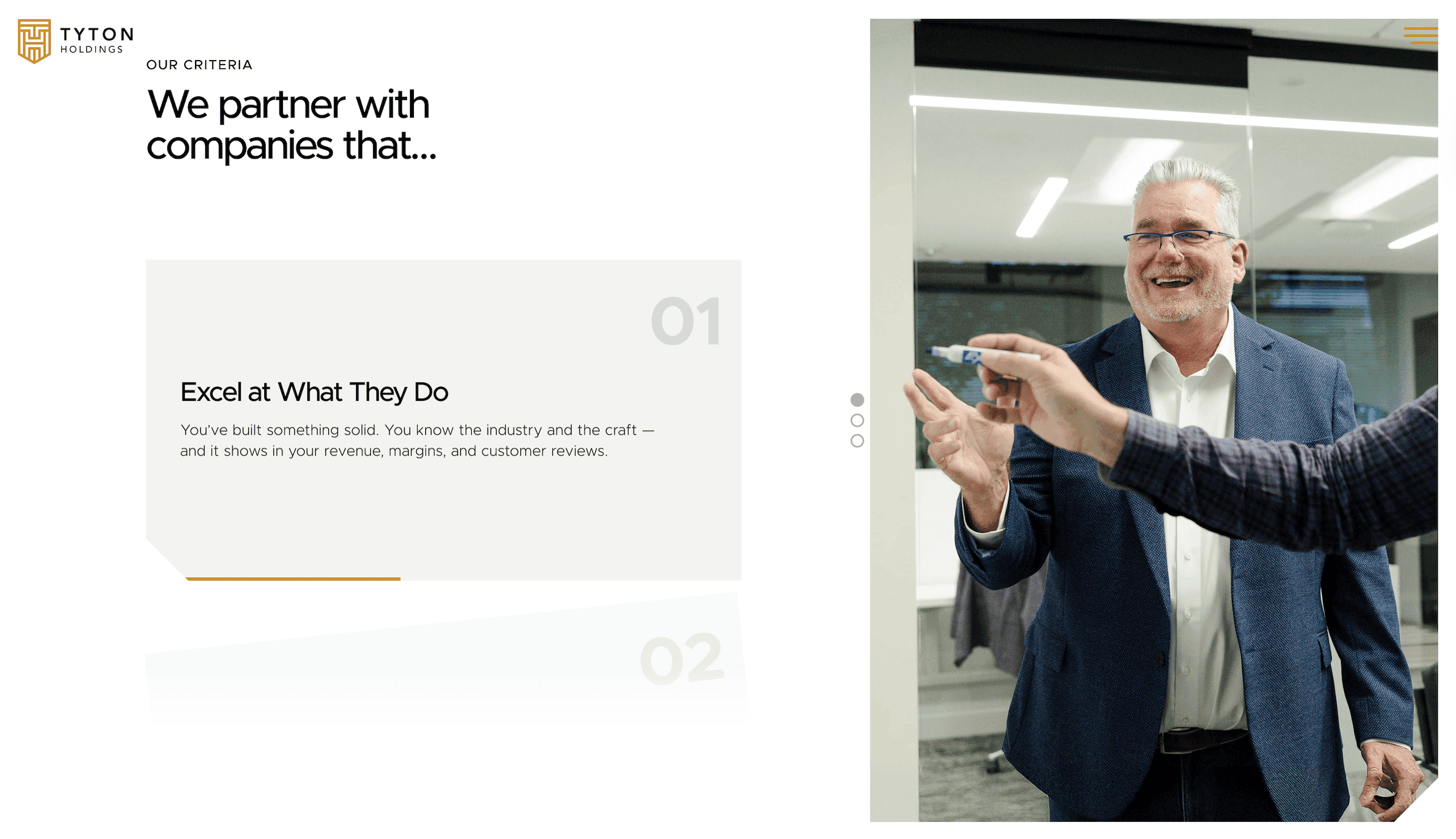 We leaned into a bold, filmic aesthetic - using black-and-white imagery with a subtle grain texture and cinematic contrast to create depth and emotion. Real photos of Tyton’s people took center stage, reinforcing authenticity and breaking away from the abstract, impersonal visuals so common in the private-equity space.