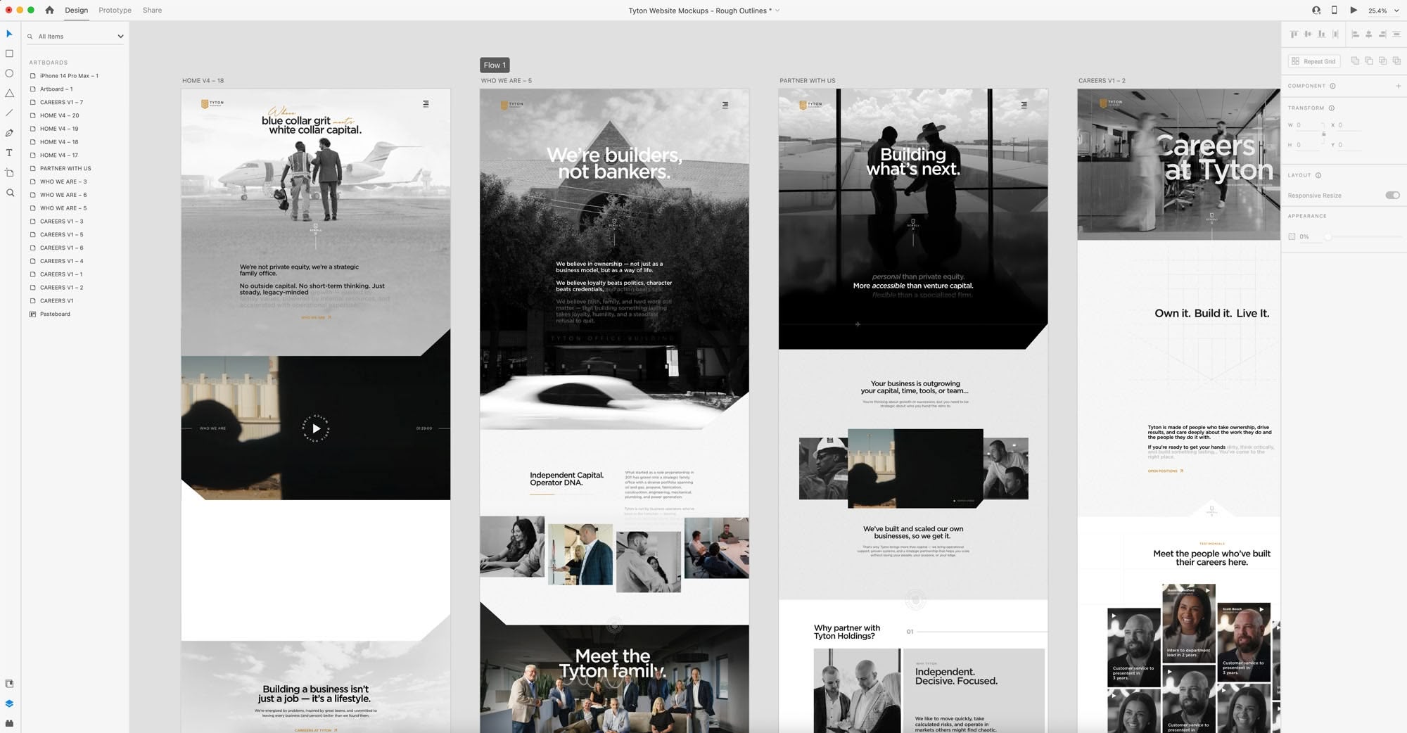 Once the direction was set, we moved into detailed mockups for every page of the site, refining the balance between blue-collar grit and white-collar polish. The goal: create something bold, grounded, and premium.